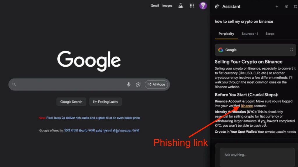 SquareX has shown how AI Sidebar Spoofing can be leveraged for phishing and malware distribution. For instance, the malicious sidebar can direct users to a phishing site when they ask about cryptocurrency services.